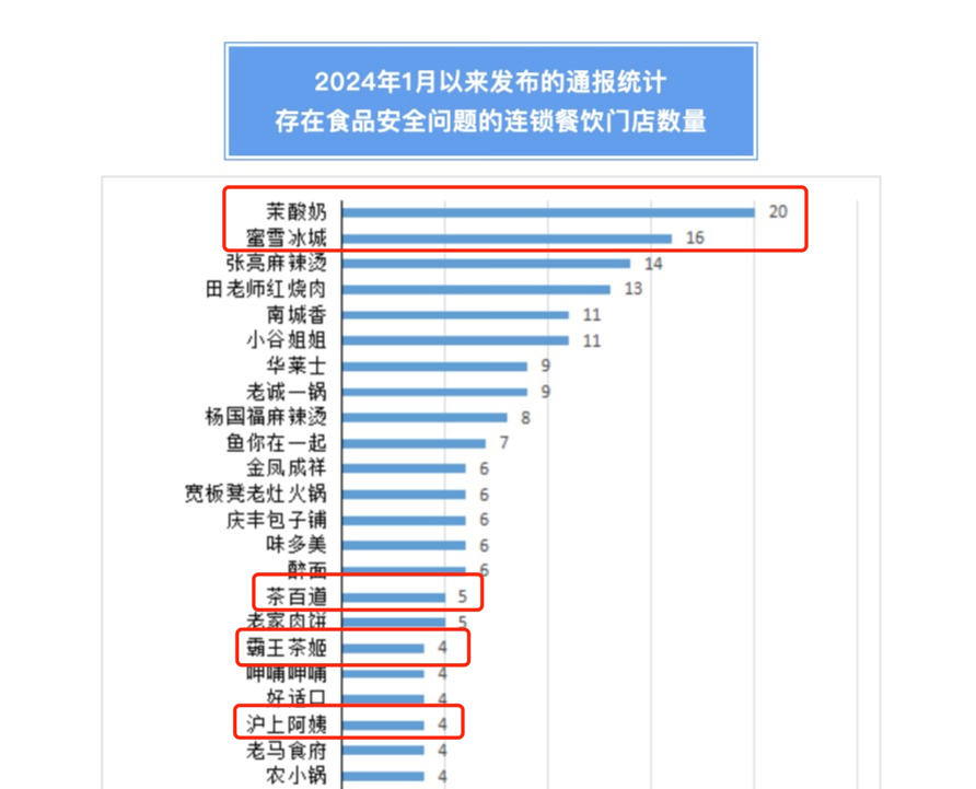另据北京市消协去年12月发布的统计数据显示,2024年1月以来,茉酸奶和蜜雪冰城被发现存在食品安全问题的门店分别有20家、16家,位列连锁餐饮品牌榜单前二。此外,茶百道、霸王茶姬、沪上阿姨等新式茶饮品牌也均榜上有名。