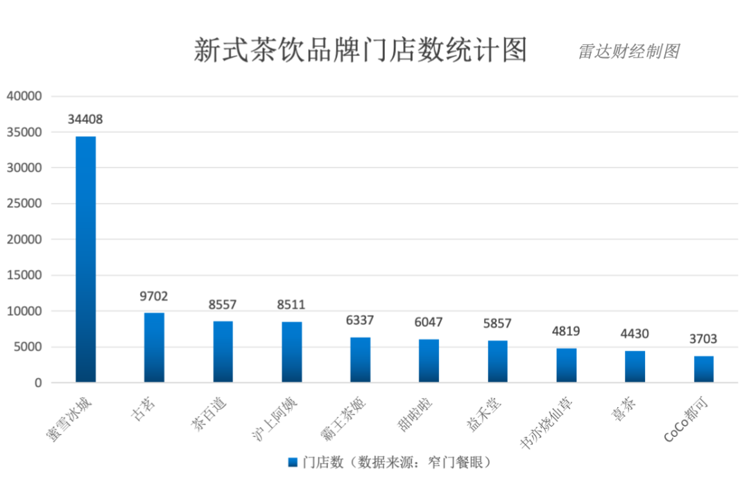 根据窄门餐眼数据显示,目前国内门店数排在前十的新式茶饮玩家,分别为蜜雪冰城、古茗、茶百道、沪上阿姨、霸王茶姬、甜啦啦、益禾堂、书亦烧仙草、喜茶和CoCo都可。